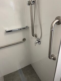 Accessible bathrooms are designed for ease of use, featuring grab bars, lowered sinks, and wide doorways.